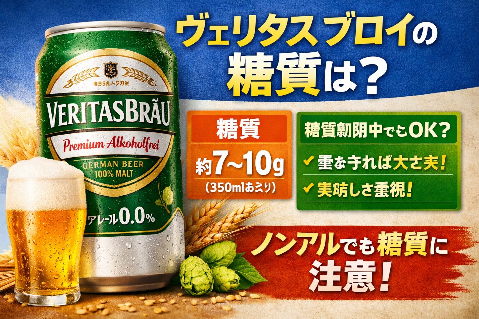 ノンアルコールビールを選ぶ際、「糖質」は気になるポイントのひとつです。中でも**ヴェリタス ブロイ(VERITASBRÄU)**は、ドイツ産の本格派ノンアルコールビールとして人気があります。本記事では、ヴェリタス ブロイの糖質量を中心に、他のノンアルコールビールとの比較や、糖質制限中に飲んでも大丈夫かどうかをわかりやすく解説します。